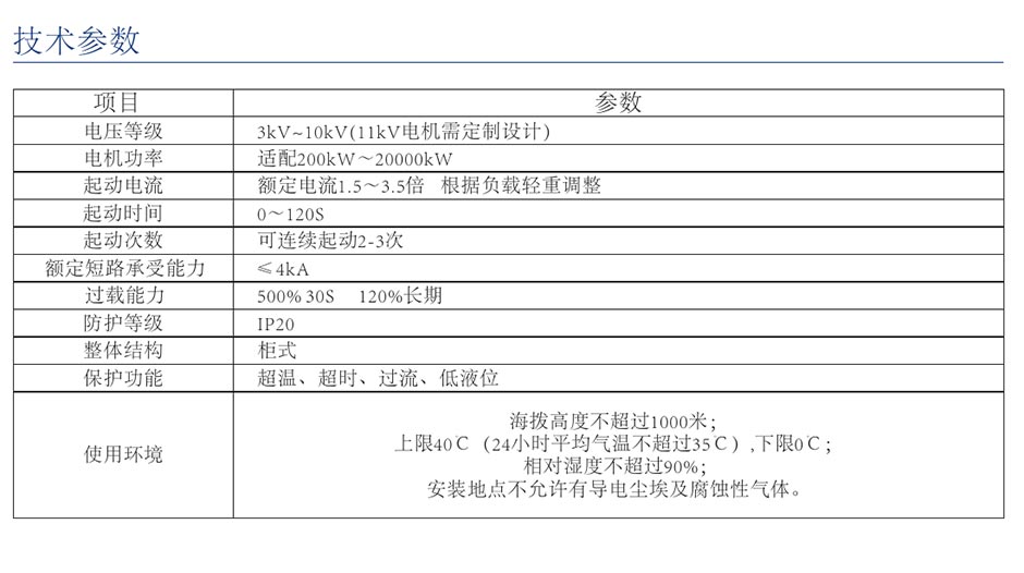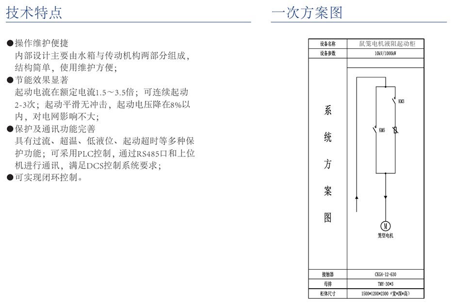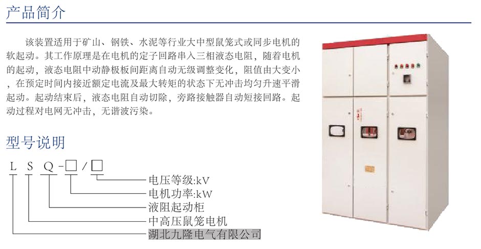 该装置适用于矿山、钢铁、水泥等行业大中型鼠笼式或同步电机的软起动。其工作原理是在电机的定子回路串入三相液态电阻,随着电机的起动,液态电阻中动静极板间距离自动无级调整变化,阻值由大变小在预定时间内接近额定电流及最大转矩的状态下无冲击均匀升速平滑起动。起动结束后,液态电阻自动切除,旁路接触器自动短接回路。起动过程对电网无冲击,无谐波污染。