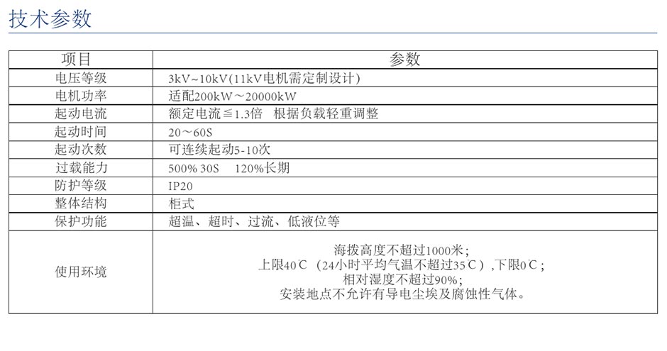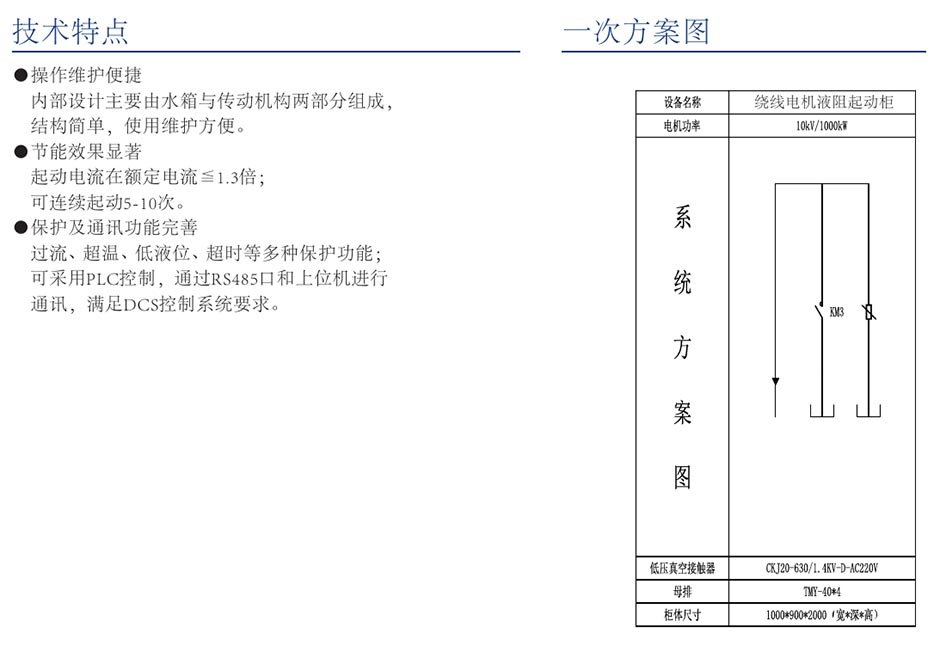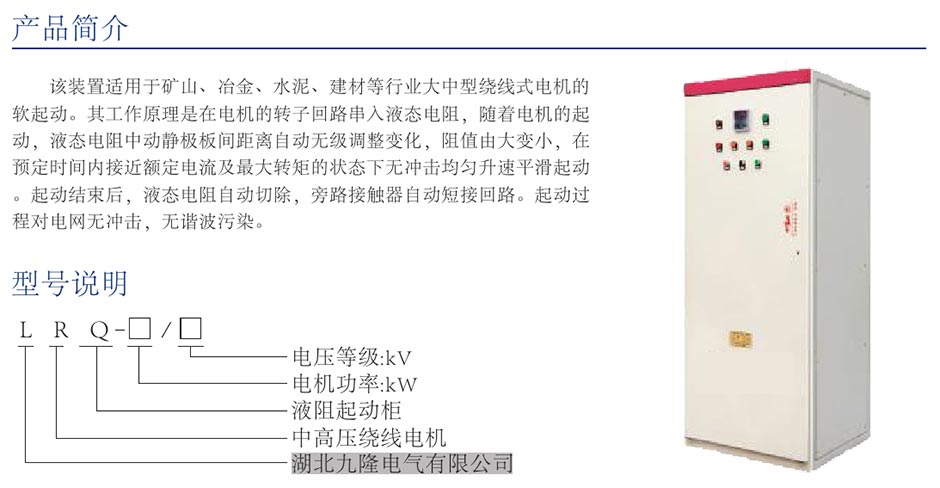 该装置适用于矿山、冶金、水泥、建材等行业大中型绕线式电机的软起动。其工作原理是在电机的转子回路串入液态电阻,随着电机的起动,液态电阻中动静极板间距离自动无级调整变化,阻值由大变小,在预定时间内接近额定电流及最大转矩的状态下无冲击均匀升速平滑起动。起动结束后,液态电阻自动切除,旁路接触器自动短接回路。起动过程对电网无冲击,无谐波污染。
