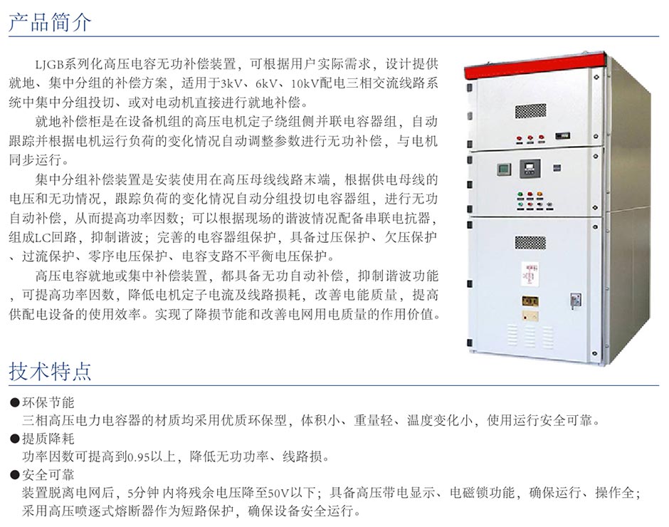 高压电容就地或集中补偿装置,都具备无功自动补偿,抑制谐波功能可提高功率因数,降低电机定子电流及线路损耗,改善电能质量,提高供配电设备的使用效率。实现了降损节能和改善电网用电质量的作用价值。