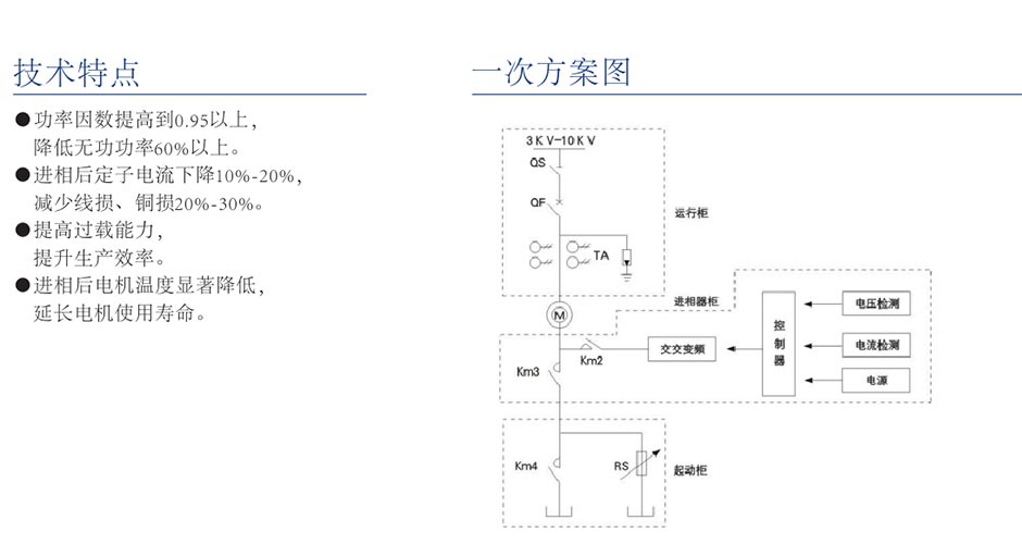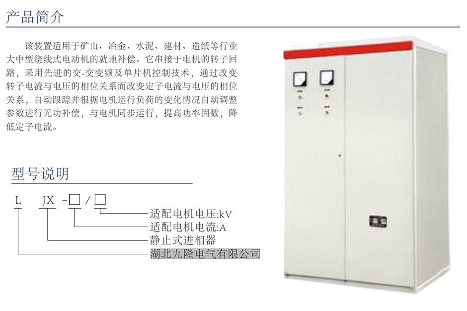 该装置适用于矿山、冶金、水泥、建材、造纸等行业大中型绕线式电动机的就地补偿。它串接于电机的转子回路,采用先进的交-交变频及单片机控制技术,通过改变转子电流与电压的相位关系而改变定子电流与电压的相位关系,自动跟踪并根据电机运行负荷的变化情况自动调整参数进行无功补偿,与电机同步运行,提高功率因数、降低定子电流。