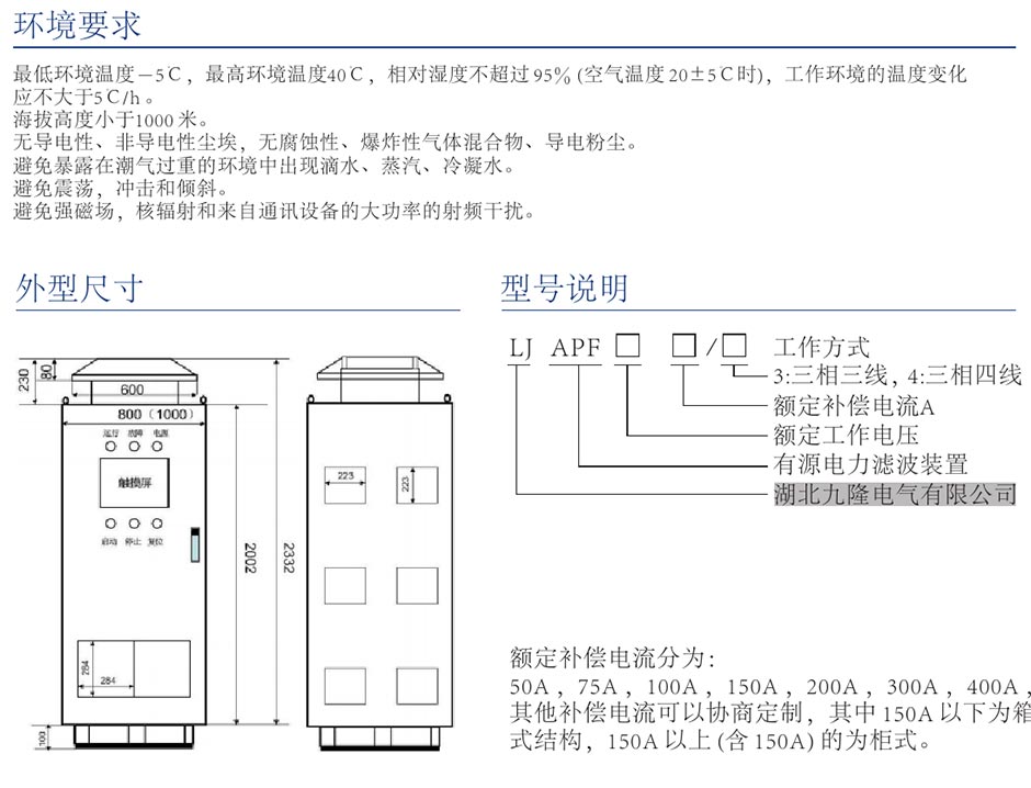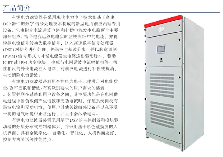 有源电力滤波器装置采用基于 DSP 的主控制器和模块驱动器的分层分布式控制器体系,并采用基于彩色触摸屏的人机界面,具有全数字化、自动化、智能化、人机界面友好控制方法灵活等性能特点。