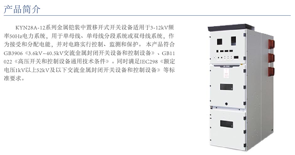 KYN28A-12系列金属铠装中置移开式开关设备适用于3-12kV频率50Hz电力系统,用于单母线、单母线分段系统或双母线系统,作为接受和分配电能,并对电路实行控制、监测和保护。 本产品符合GB3906《3.6kV-40.5kV交流金属封闭开关设备和控制设备》、GB11022《高压开关和控制设备通用技术条件》。同时满足IEC298《额定电压1kV以上52kV及以下交流金属封闭开关设备和控制设备》等标准要求。