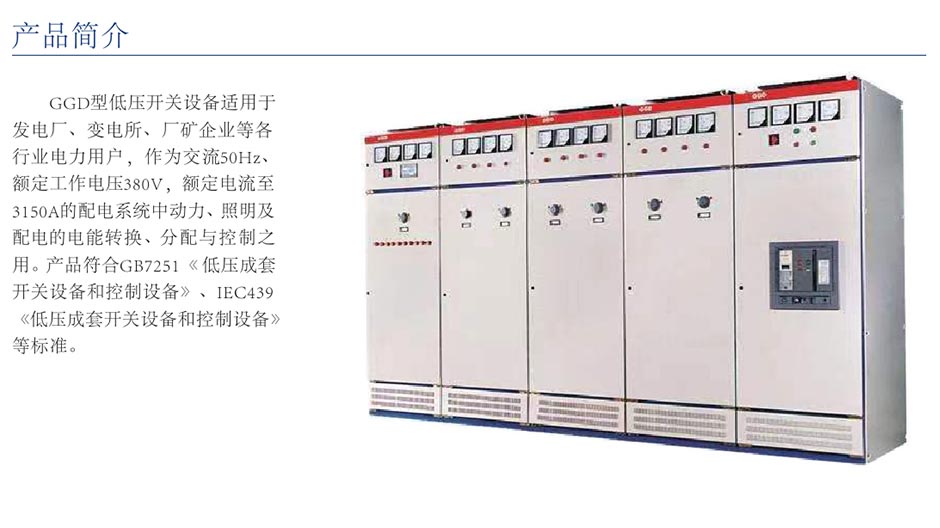 GGD型低压开关设备适用于发电厂、变电所、厂矿企业等各行业电力用户,作为交流50Hz、额定工作电压380V,额定电流至3150A的配电系统中动力、照明及配电的电能转换、分配与控制之用。产品符合GB7251《低压成套开关设备和控制设备》、IEC439《低压成套开关设备和控制设备》等标准。